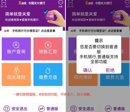 光大银行APP主界面友好程度较去年有提升,APP以紫色为主色调。特别值得一提的是,光大银行推出了简爱版APP,用户可以从普通版本一键切换至简爱版,简爱版主页面仅保留4项用户最常用的功能,字体变大,整体显示清晰,贴合了部分追求简便快捷用户的需求。