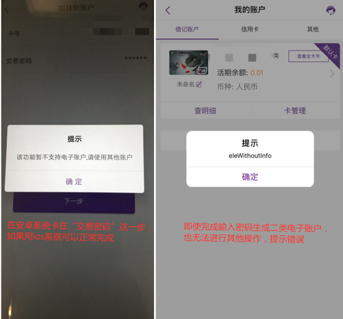 但在评测中发现,部分用户(非本行)注册开通过程遇到障碍。详细来说,注册以后根据提示开通电子账户,需要上传证件→输入客户信息→输入交易密码。而“输入交易密码”这一环节,安卓系统提示“该功能暂不支持电子账户”,而ios系统可以正常完成。这一步骤完成以后,可以在“我的账户”中看到已经持有一张Ⅱ类借记账户,但任何操作都提示“eleWithoutInfo”,咨询在线客服提示咨询95599,电话客服建议去柜台进行身份验证。