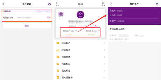 光大银行APP“我的”页面可以看到资产、负债情况,点击可以看到资产、负债明细表,但与同业相比,缺乏图形化展现。
