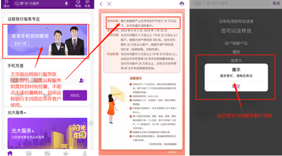 在语音、视频互动方面,光大银行APP有语音搜索、语音转账功能,但测试过程中,曾出现“服务繁忙,请稍后再试”的情况。值得一提的是,光大银行APP主页推荐 “远程银行服务专区”,点击进入相关说明,而不是直接跳转远程银行服务。据了解,目前APP远程银行服务仅限部分客户使用。