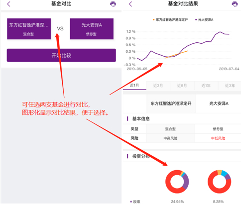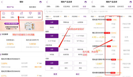与去年相比,用户较常投资的银行理财、基金等进行了系统性功能建设。比如,银行理财在产品超市的基础上,增加了智能化推荐、光大资管研究院等资讯服务,每只产品的风险、收益展示较为直观;基金产品分类清晰,支持筛选,并且可以任意选取两支基金进行对比,方便用户选择。