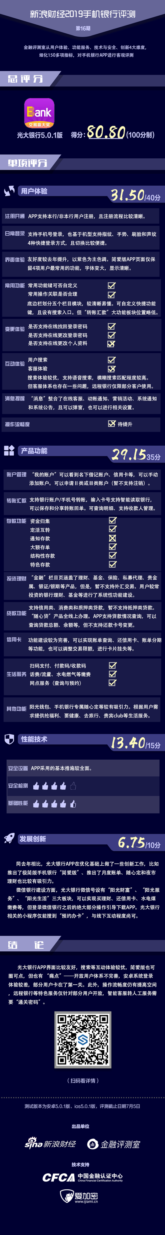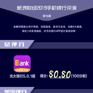 金融评测室综合用户体验、产品功能、性能安全、创新发展4大维度,150多项细分指标对光大银行手机银行APP进行全扫描,最终给予80.80分(总分100)。