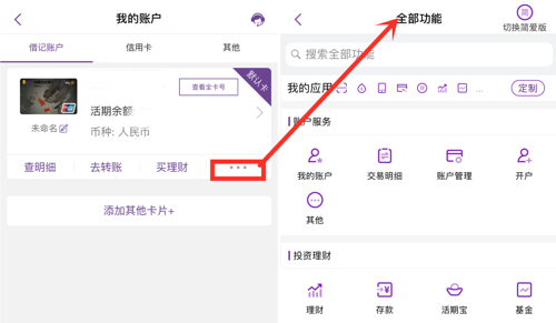 但是,APP账户查询 “…”关联到“全部功能”不太合理,同业一般直接关联到账户管理等相关功能。