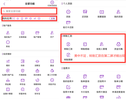 用户点击“全部·定制”,既可以查看所有功能,也可自定义快捷功能键,且设有搜索入口。其中,用户可以设置最少4个最多9个快捷功能键,也可以拖动调整顺序。但不足之处在于,常用的“转账汇款”大功能板块位置略低。