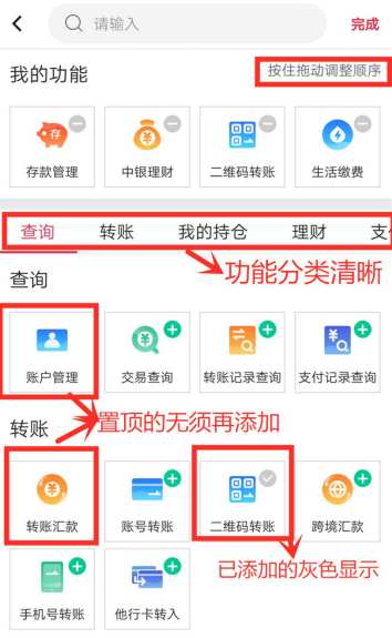 中国银行APP界面较为友好,底边栏设置为“首页”、“理财”、“生活”和“我的”4个栏目页,且风格、色调较为统一。与去年相比,首页上方置顶了“扫一扫、收付款、转账和账户管理”4个常用功能键,定制功能区采用自适应模式——支持最少“0+1”最多“9+1”个快捷功能键。用户点击“更多”,既可以浏览\搜索全部功能,也可以自定义“我的功能”,且自定义逻辑比较顺畅。