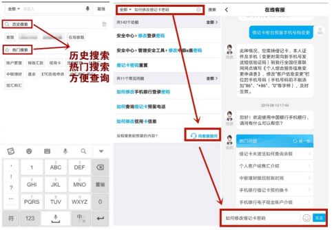 搜索互动方面,中国银行APP支持搜索功能、产品和常见问题,且模糊搜索匹配程度较高。值得一提的是,在搜索不满意/无结果时可以联动在线客服,且能将搜索内容代入客服,整体表现较优。美中不足之处在于,APP仅在首页设有搜索入口,建议在理财、生活等功能集合较多的页面增加搜索入口。