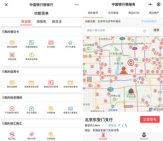 微信银行方面,“中行微银行”公众号提供“微金融”、“微服务”、“微生活”三大类功能服务,包含账户查询、交易服务、信息查询、预约及营销等11项服务,也可以点击“更多功能”进入微银行交易大厅。此外,中国银行上线了“中行微服务”小程序,提供预约排队、外币预约以及周边ATM和商户查询服务。