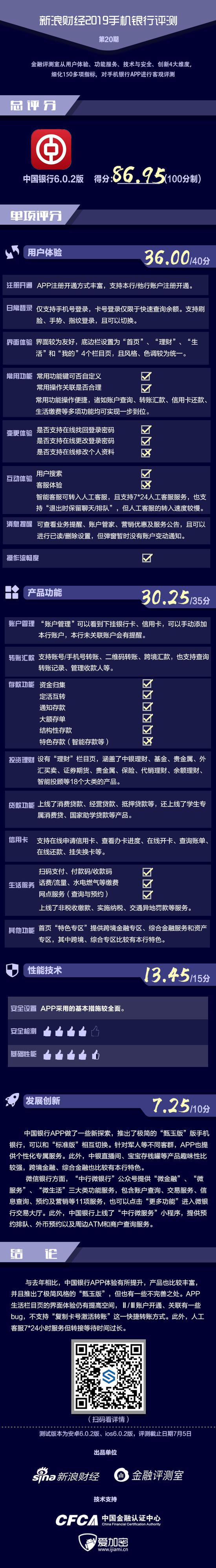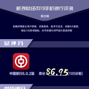 金融评测室综合用户体验、产品功能、性能安全、创新发展4大维度,150多项细分指标对中国银行APP进行全扫描,最终给予86.95分(总分100)。