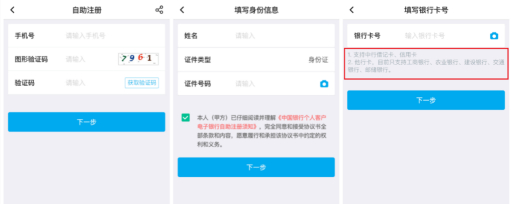 中国银行APP注册开通方式丰富,用户可以在APP自助注册,也可以通过柜台、智能柜台、其他移动终端等开通。APP支持本行/非本行用户注册(工行、农行、建行、交行、邮储银行),且流程清晰操作便捷,支持OCR技术识别客户证件信息及卡号。