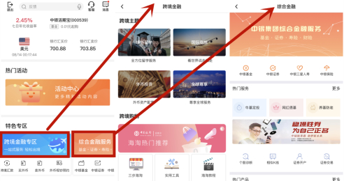 值得一提的是,中国银行APP首页“特色专区”提供跨境金融专区、综合金融服务和资产专区,其中跨境、综合专区场景切入较强,也比较有本行特色。