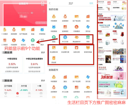 此外,“理财、生活”2个栏目页也采用相同风格——均支持自定义快捷功能区。但遗憾的是,两个页面的自定义功能小有bug——添加快捷功能键时没有提示数量限制,但在理财/生活栏目页只会显示前9个功能。另外,生活栏目页界面友好度仍可提高,下方布满了密密麻麻的推广图。