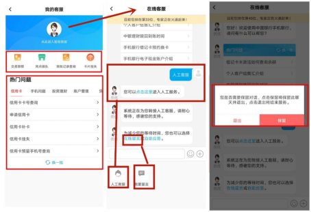 客服体验方面,中国银行APP在各栏目页、重要操作以及操作不成功时都能找到在线客服入口。客服页面中包括热门问题及四个功能设置快捷方式——“交易限额设置”、“网点排队”、“转账记录查询”、“卡片挂失”,最上方可进入智能客服。智能客服可转入人工客服,且支持人工客服7*24服务,也支持留言反馈。值得一提的是,退出在线客服时会提示是否保留聊天——这一设置比较人性化,尤其是在转接人工服务中,可以保留排队记录。