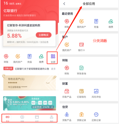 APP主界面较为友好。底边栏分为“首页”、“财富”、“信贷”、“我的”四个栏目页。其中“首页”设有主功能区,有“转账”、“我的资产”、、“充值”、、“缴费”四个功能按钮和一个“全部”。其中,“全部应用”按类排列,分类清晰。