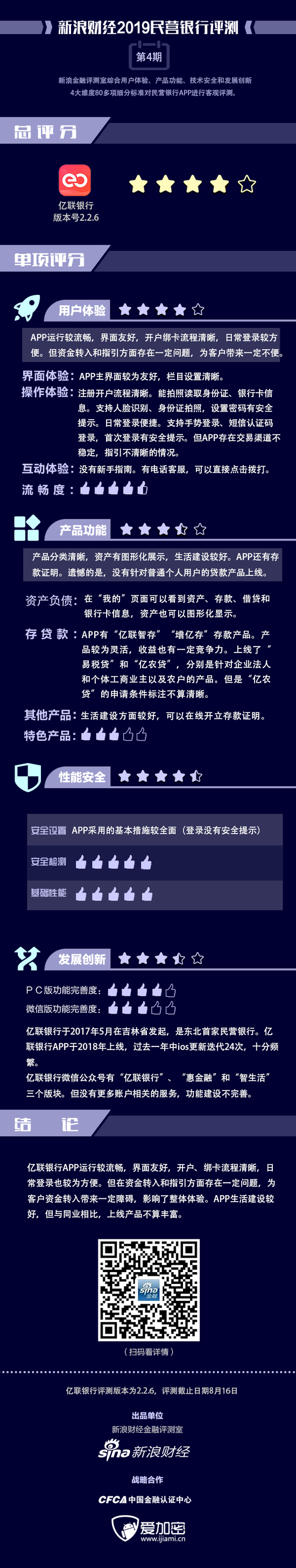 金融评测室综合用户体验、产品功能、技术安全、发展创新4大维度,80多项细分指标对亿联银行APP进行全扫描,最终给予4星评级(最高评级5星)。