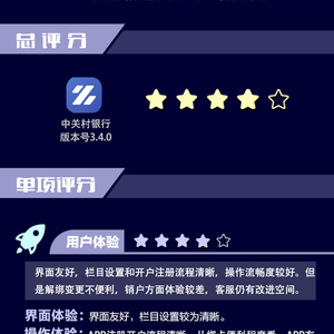 综合来看,中关村银行APP界面友好,栏目设置和开户注册流程清晰,操作流畅度较好。但是,APP银行卡解绑变更不便利,销户方面体验较差,客服体验方面仍有改进的空间。