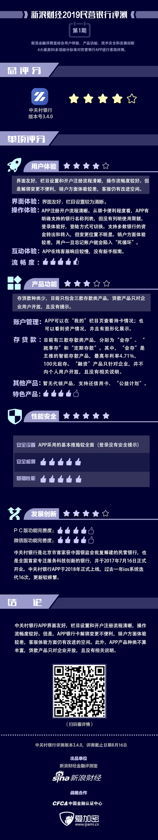金融评测室综合用户体验、产品功能、技术安全、发展创新4大维度,80多项细分指标对中关村银行APP进行全扫描,最终给予4星评级(最高评级5星)。