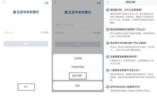 中关村银行APP登录体验较好。APP支持用户手机号和身份证号登陆,也可以通过刷脸、手势密码、指纹登陆,登陆方式可切换。若用户忘记登陆密码,可通过身份证认证与刷脸验证修改密码。APP支持在线变更登录密码。值得一提的是,在登陆页面点击“更多”时,会出现“遇到问题?”的字样,APP会对“密码报错”、“账号被锁定”、“注册所需资料”等问题给与简要指引。