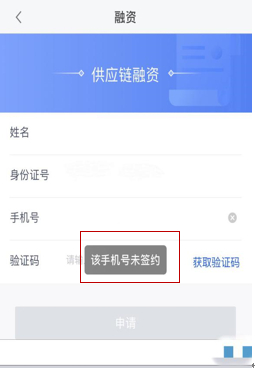 在贷款方面,中关村银行APP“首页”主功能区设有“融资”按钮,点击可以看到“供应链融资”,但在输入用户信息后却显示“手机号未签约”字样。咨询客服后得知,这款产品只针对企业,并不向个人用户开放。