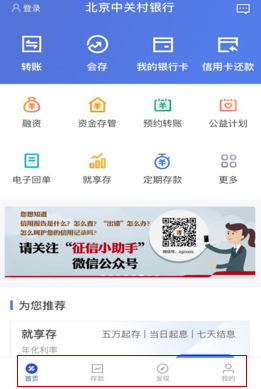 中关村银行APP主界面设计友好,栏目设置较为清晰。APP整体操作主界面底边栏分为“首页”、“存款”、“发现”和“我的”四个板块,界面颜色以蓝色为主,配色较和谐。