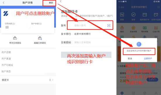 具体来看,当用户删除已注册的中关村银行账户后,如果想再次添加,只会提示输入中关村银行账户(但电子账户没有实体卡,用户大概率会忘记账户)。与此同时,用户再次点击各个功能按钮时,会提示“没有开立银行账户”,根据提示选择 “立即开户”,则又回到添加页面——也就是说,用户一旦忘记账户,就会陷入“死循环”,建议在“删除”选项中增加相关提示或增加“找回账户”功能。