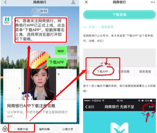 网商银行APP可以在手机应用商店搜索下载,也可以在官方网站上扫码下载。网商银行微信公众号没有提供下载入口,并且微信栏目已经变更,但欢迎语和下载指引没有及时更新。