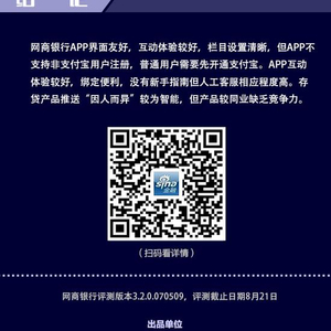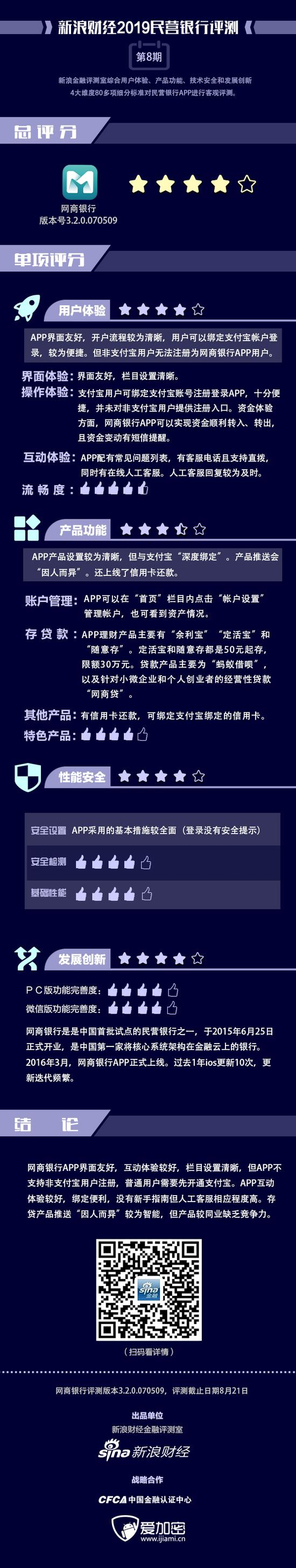 金融评测室综合用户体验、产品功能、技术安全、发展创新4大维度,80多项细分指标对浙江网商银行APP进行全扫描,最终给予4星评级(最高评级5星)。