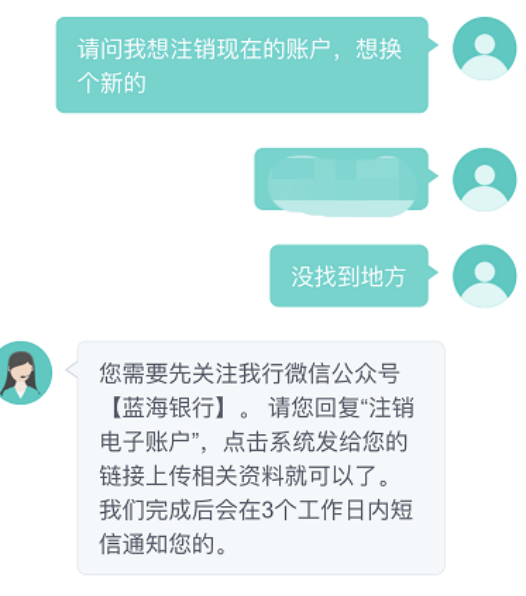 蓝海银行APP支持在线变更手机号,且变更流程较为清晰。但是,蓝海银行APP不支持在线注销账户,用户须前往蓝海银行的微信银行,联系客服申请注销。且注销账户需三个工作日左右,不能实时销户。
