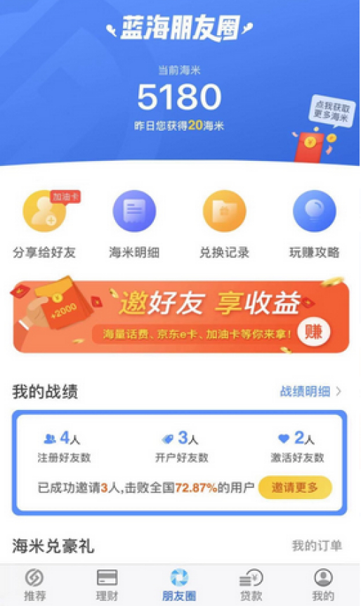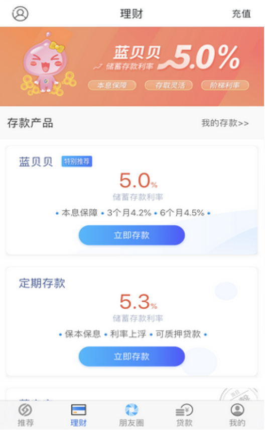 蓝海银行APP主界面设计友好,栏目设置较为清晰。APP整体操作主界面底边栏分为“推荐”、“理财”(安卓为“财富”)、“朋友圈”、“贷款”和“我的”五个板块,界面配色较和谐。