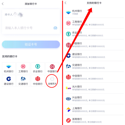 杭银直销APP注册快捷,开户流程也较为清晰,绑卡环节会提供支持银行卡列表,输入银行卡号还能自动识别所属银行,并可以查看各个银行单笔限额和单日限额。技术上,APP支持拍照读取身份证和银行卡信息,也有人脸认证。