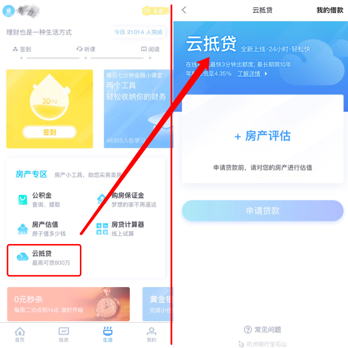 与设置醒目且种类丰富的理财产品相比,杭银直销APP贷款产品则“隐藏”于其它服务之中。在“房产专区”内,可以看到有一款名为“云抵贷”的贷款产品,用户线上经过房产评估再完成相关资料填写即可申请。