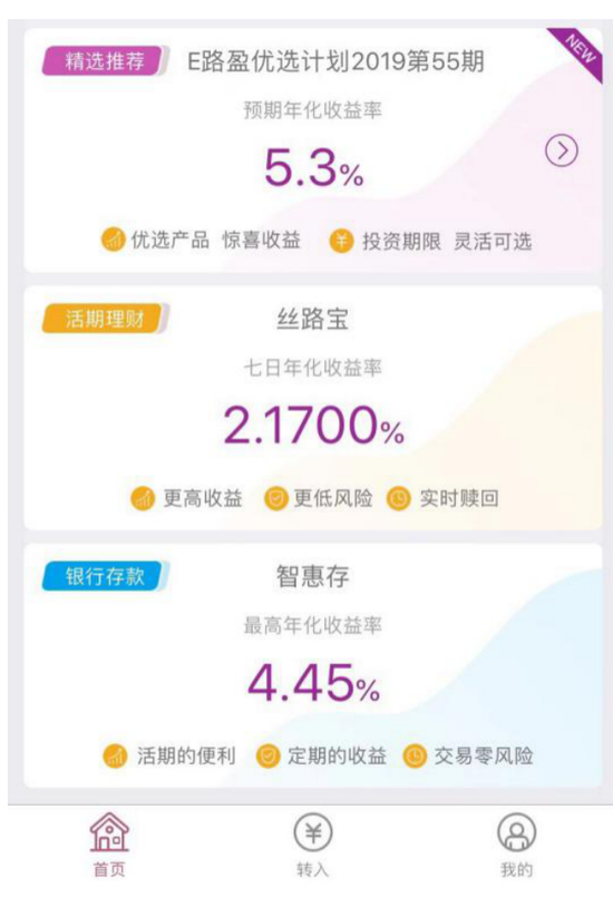 新丝路Bank APP的产品主要在“首页”体现。在首页有“精选推荐”、“活期理财”和“银行存款”三个板块。分别对应 “E路盈优选计划”、“丝路宝”、“智慧存”三款产品。