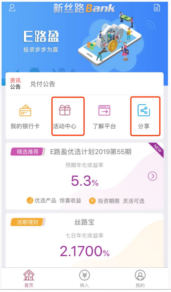 西安直销银行新丝路Bank APP主界面设计一般,底边栏设有“首页”、“转入”、“我的”三大板块。其中首页的主功能区设有“我的银行卡”、“活动中心”、“了解平台”和“分享”4个功能,但“活动中心”暂未开放,“分享”用于引流。