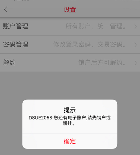 在销户体验方面,APP较去年没有变化。依旧保留了去年的栏目设置:账户管理下有“销户”功能,同时还有“解约”功能。未销户时点击解约,会有相关提示。
