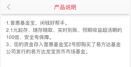 具体来看,“普惠宝”页面包括普惠基金宝1号等货币基金,1元起投,收益基本与余额宝持平,但部分产品说明较简略。