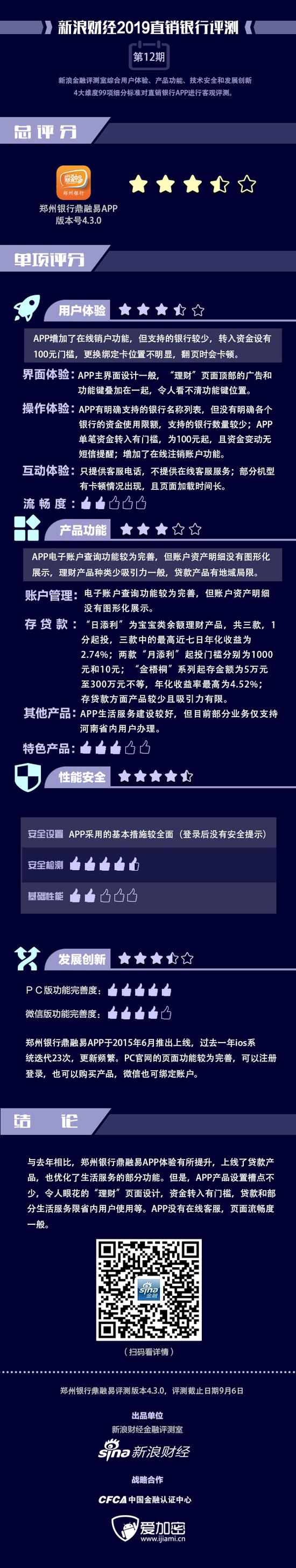 金融评测室综合用户体验、产品功能、技术安全、发展创新4大维度,99项细分指标对郑州银行“鼎融易”APP进行全扫描,最终给予3.5星评级(最高评级5星)。