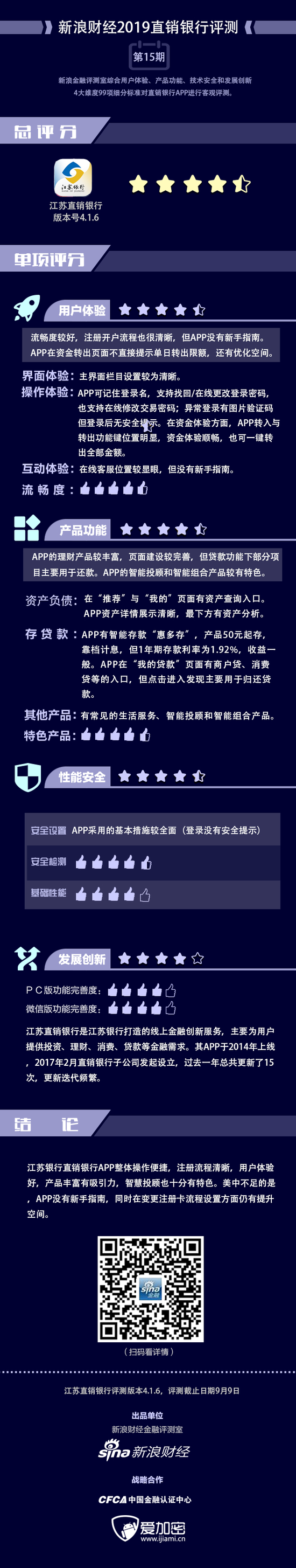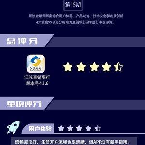 金融评测室综合用户体验、产品功能、技术安全、发展创新4大维度,99项细分指标对江苏直销银行APP进行全扫描,最终给予4.5星评级(最高评级5星)。