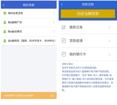 江苏银行直销银行APP上线的贷款产品主要有经营贷款“税e融”和“电e融”,在“我的贷款”页面还有商户贷、消费贷等的入口,但点击进入发现主要用于归还贷款。