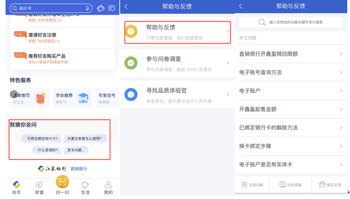 与用户互动方面,江苏银行直销银行APP在线客服位置较显眼,除了“我的”页面之外,其他主要页面均可跟随。但美中不足的是APP没有新手指南。