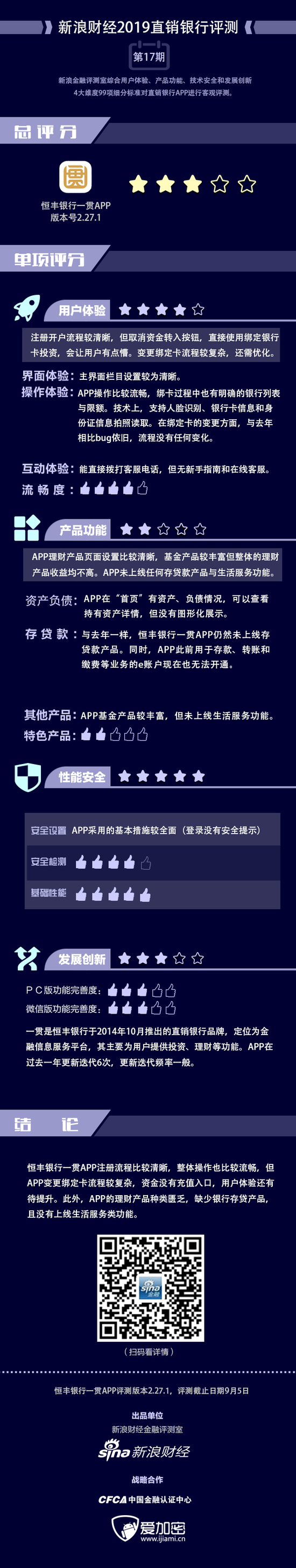 金融评测室综合用户体验、产品功能、技术安全、发展创新4大维度,99项细分指标对恒丰银行一贯APP进行全扫描,最终给予3星评级(最高评级5星)。