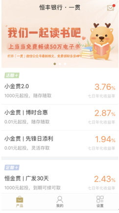 “定期”板块中的产品“恒金贯”,七日年化收益率为2.43%,1000元起投,投资期限30天,是一款债券型证券投资基金。