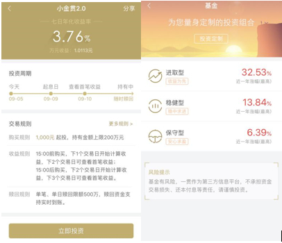 APP基金板块产品比较丰富,总共分为进取型、稳健型与保守型,产品可依照类型进行筛选,也可以排序。产品页面建设也比较清晰。