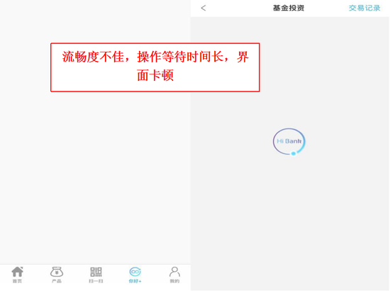 综合来看,“你好银行”APP用户体验相对去年没有太大提升,界面简洁明了,但整体流畅度欠佳,每步操作等待时间较长,部分机型偶有闪退,仍有进一步提升空间。