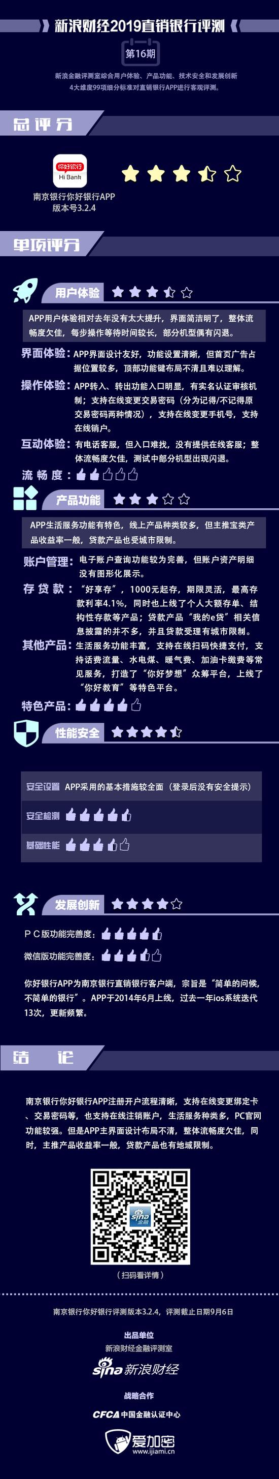 金融评测室综合用户体验、产品功能、技术安全、发展创新4大维度,99项细分指标对南京银行“你好银行”APP进行全扫描,最终给予3.5星评级(最高评级5星)。