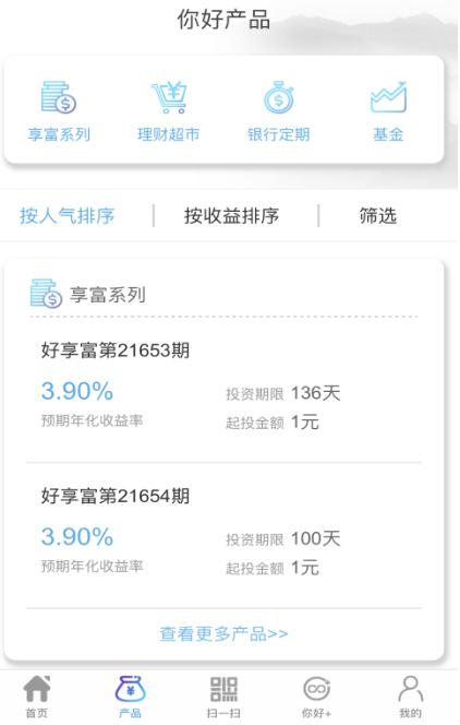 APP产品页面分类设计清晰,分为 “享富系列”、“理财超市”、“银行定期”和“基金”四大板块,且支持排序、筛选。