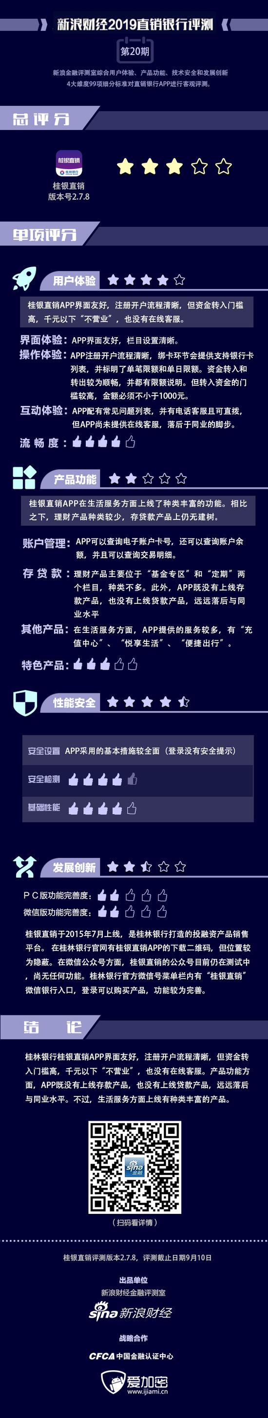 金融评测室综合用户体验、产品功能、技术安全、发展创新4大维度,99项细分指标对桂林银行桂银直销APP进行全扫描,最终给予3星评级(最高评级5星)。