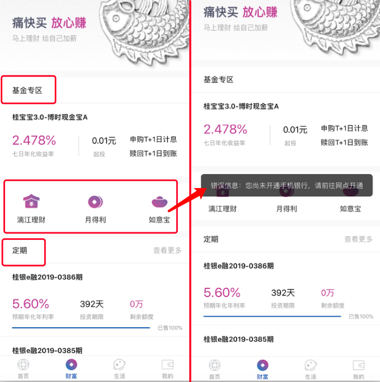 在“财富”页面中部还有“漓江理财”、“月得利”和“如意宝”三款产品入口,但使用上述三款产品必须前往网点开通手机银行。