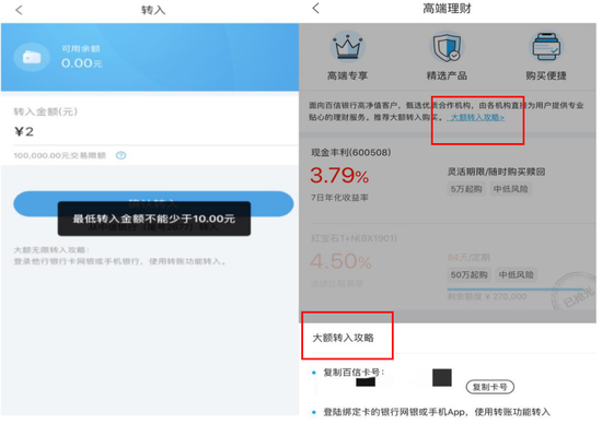 APP资金体验较好。转入、转出功能入口明显,用户可通过点击“首页”或者“我的”栏目页的“转入”和“转出”进行资金转账。资金转入时有限额提示,每次转入金额不能低于10元。资金转出时会提示单日转出限额和可转出金额,且支持一键输入全部余额,到账时有短信提醒。美中不足的是,APP虽然有超额转入的指南,但在“转入”页面并不能直接链接,在高端理财的页面却可以直接查看,此处设置有待改进。
