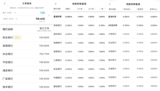 在生活服务方面,APP支持在线扫码支付,可在线手机话费和流量充值,同时也有生活美食、电影票、油卡充值等服务。值得注意的是,APP的“爱生活”板块提供了汇率查询、存贷款利率查询,用户可对比多家银行相关利率,十分便捷。APP的一款权益类产品“权宝宝”,可存款获取视频会员,具有一定的吸引力。