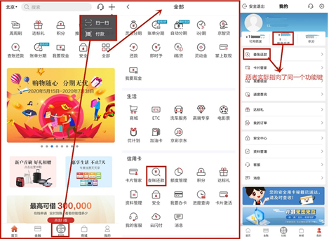 APP常用功能区采用了“9+1”的十宫格模式,用户点击“全部”可以查看全部功能,但不支持用户自定义设置。值得注意的是,“全部”的界面设置有待提升:一是,最常用的“查账还款”被放置在第三个分类;二是,缺乏“搜索”入口。