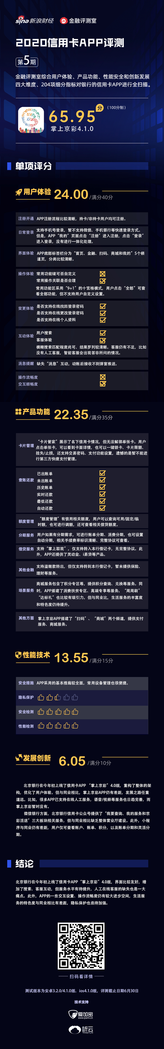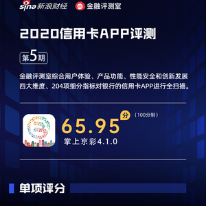金融评测室综合用户体验、产品功能、性能安全、创新发展4大维度,200多项细分指标对北京银行信用卡APP“掌上京彩”进行全扫描,最终给予65.95分(总分100)。